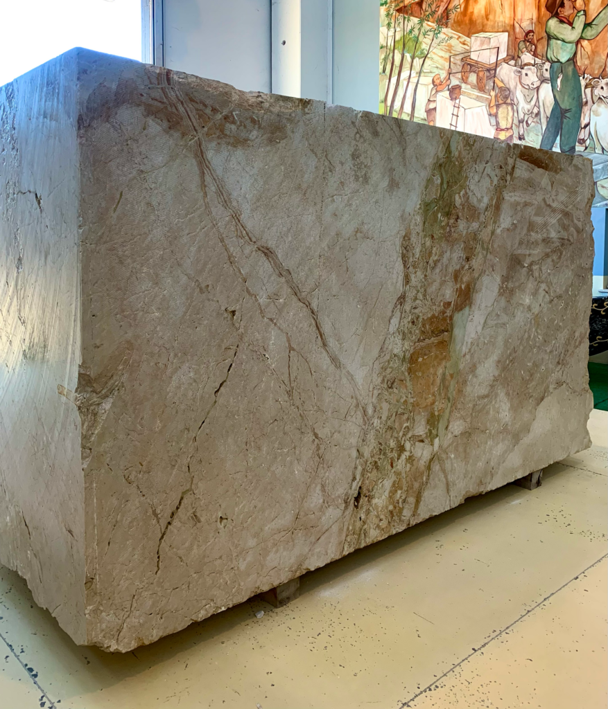 Material: Breccia Aurora Origin: Italian Quarry Dimensions: 328 x 180 x 150 cm Weight: 23.74 tons Color: Beige Structure: Brecciated Condition: Rough marble block Applications: Slabs, flooring, architectural stone Availability: In stock
